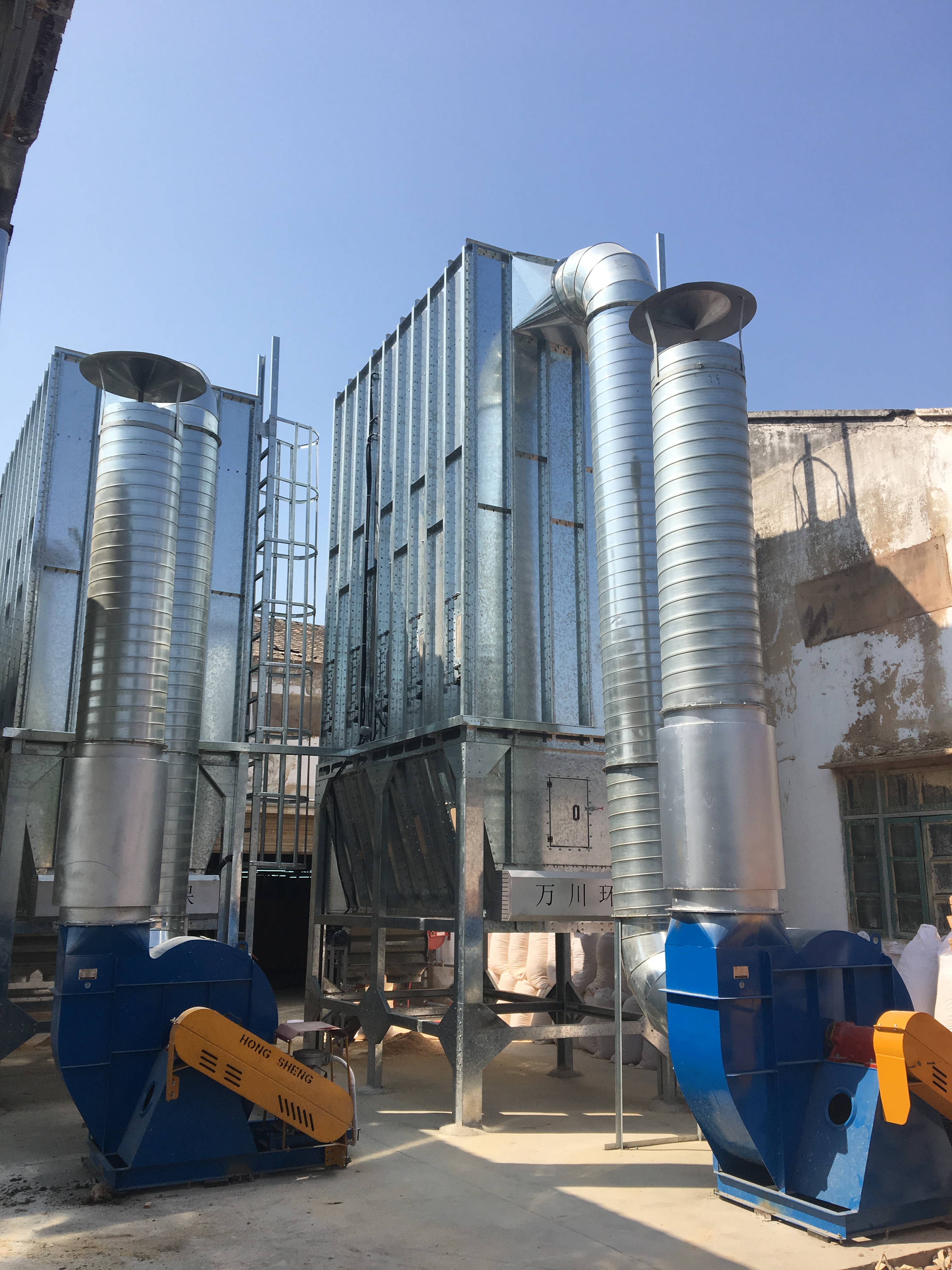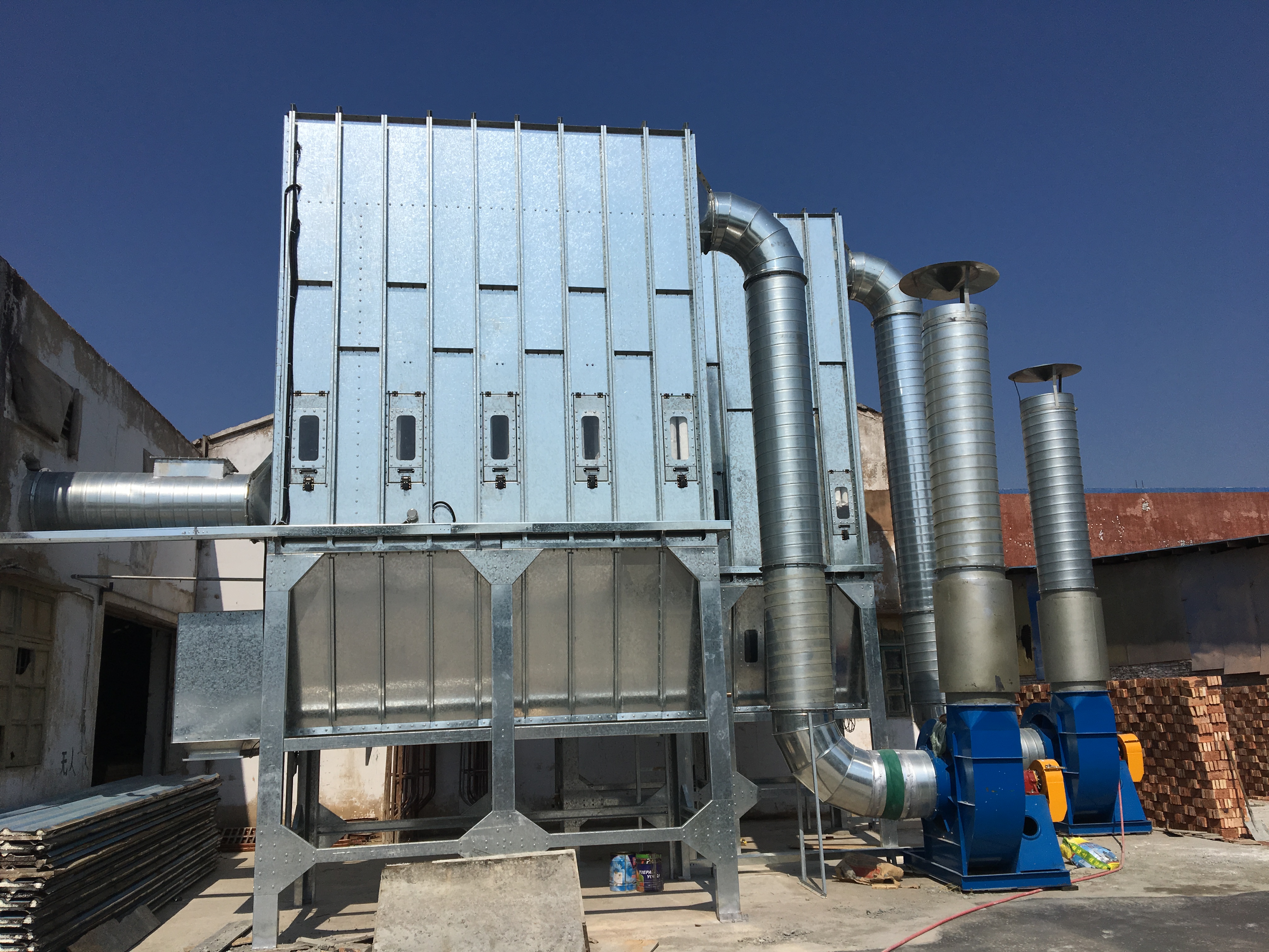 根據車間設備布置情況,由于木工機械吸塵口所需的風量及風壓、風速要達到要求,并預留一些風量,因此我們采用過濾能力較強脈沖袋式除塵器,匹配相應的排塵風機,達到最佳吸塵效果。