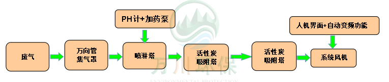 廢氣從氣體收集系統收集后,進入水噴淋塔,經濕式旋流板廢氣塔進一步清洗處理后,通過加壓引風機引入活性炭吸附裝置,由于固體吸附劑表面上存在著未平衡和未飽和的分子引力或化學鍵力,因此當吸附劑的表面與氣體接觸時,就能吸引氣體分子,使其濃聚并保持在吸附劑表面,此現象稱為吸附。利用吸附劑固體表面的吸附能力,使有機廢氣中的VOC與大表面的多孔性吸附劑相接觸,廢氣中的污染物被吸附在固體表面上,使其與氣體混合物分離,進入活性炭吸附裝置,去除有機廢氣及刺激性異味氣體后經排氣筒高空排放。