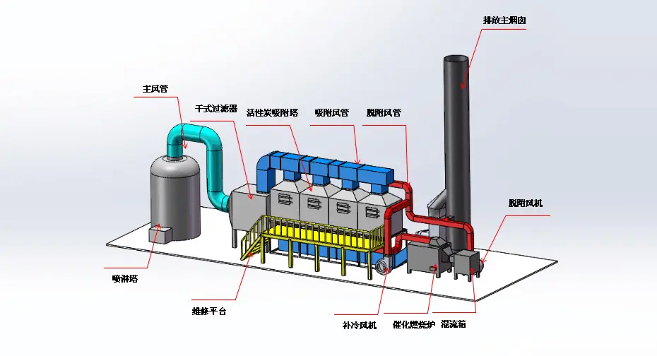 催化凈化是典型的氣固催化反應(yīng),其實質(zhì)是活性氧的氧化。在催化凈化過程中,催化劑的作用是降低活化能。同時,催化劑表面具有吸附作用,使反應(yīng)物分子在催化劑表面富集,提高了反應(yīng)速率,加快了反應(yīng)速度。在催化劑的作用下,廢氣可以在較低的著火溫度下進行無焰燃燒,并被氧化成CO2和H2O。同時,大量的熱能被釋放出來,從而達到去除廢氣中污染物的方法。通過活性炭吸附,將風(fēng)量大、濃度低的廢氣濃縮成風(fēng)量小、濃度高的廢氣,在進入RCO裝置進行處理,可節(jié)約運行成本。