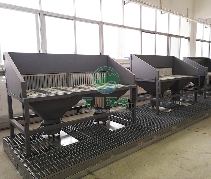根據對該公司的實際考察情況,金屬打磨粉塵具有易燃易爆的性質,綜合多方面的考慮,優先采用低能耗、低運行費用、基建投資省、工期短、操作管理簡便、已成熟的粉塵處理工藝。最終選用“打磨臺+脈沖濾筒除塵器”對粉塵進行處理并收集。該工程中使用的是干式除塵工藝,該工藝除塵效率高,達到99%以上,適應性強,除塵效率不受粉塵濃度影響,收集后可回收粉塵。